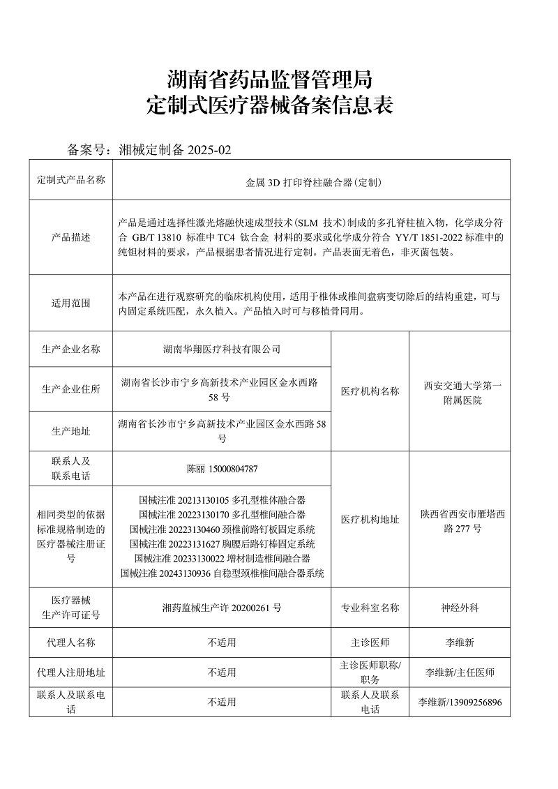 定制式医疗器械备案信息表(湘械定制备2025-02)