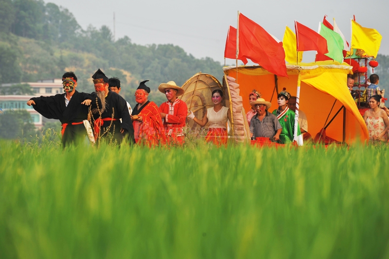 珠梅“抬故事”是出现在湘中地区的一项颇有影响的民间活动。地处湖南省涟源市龙塘乡。明崇祯年间,当时道教已传入安化(现涟源市)各地,珠梅“西元山观”是最早建立的道教寺观之一,在当时战乱、民不聊生的情况下,人们祈求祛病消灾,以道教斋醮形式,许愿“抬故事”,以了人们的心愿,如此“抬故事”的活动就逐渐得到发展,延续几十代而发展至今。改革开放以后,逐渐推陈出新,既保持了古俗风貌,又创立了一些新的形式,从而逐步演变成了扬善惩恶的一种群众性自娱文化活动。它取材于神话传说,历史故事和现实生活,一台故事一个人物,表达一个故事史实,反映人们一种期望。“故事”形式多样,既有原始型的,又有现代型的,如:“东吴成亲”、“红色娘子军”、“农家乐”等还有“揪千故事”,“盘故事”、“船故事”、“马故事”、“夜故事”等。它以形象达意、流动表意,被人们称为“流动舞台”。其中高低桩的每台故事一个座台,一米见方,高约0.8米,红布铺盖,支有包装精致的铁架,整高丈余。故事台架的最上层称之为“太子”,由一岁左右的幼儿扮演。中层称之“臣子”,由10岁左右的儿童少年扮演,化戏剧人物妆,站立于座台上。座台的前后是四名抬杠的,两边跟随两名持长叉的武士。一台故事,三层人物,年龄悬殊,形态各异,化妆不拘一格,浓淡相宜,相映成趣,各种不同形式的故事。