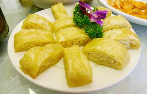 三、笼屉内轻刷一层熟猪油,放人脑髓卷生坯,放沸水蒸锅上旺火蒸15分钟至熟即成。