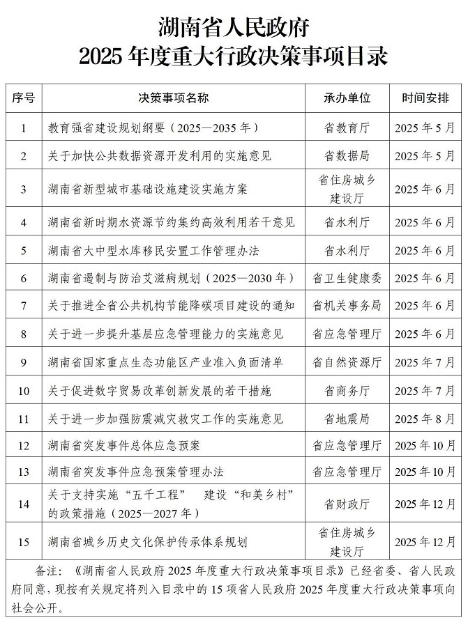 湖南省人民政府办公厅关于印发《湖南省人民政府2025年度重大行政决策事项目录》的通知