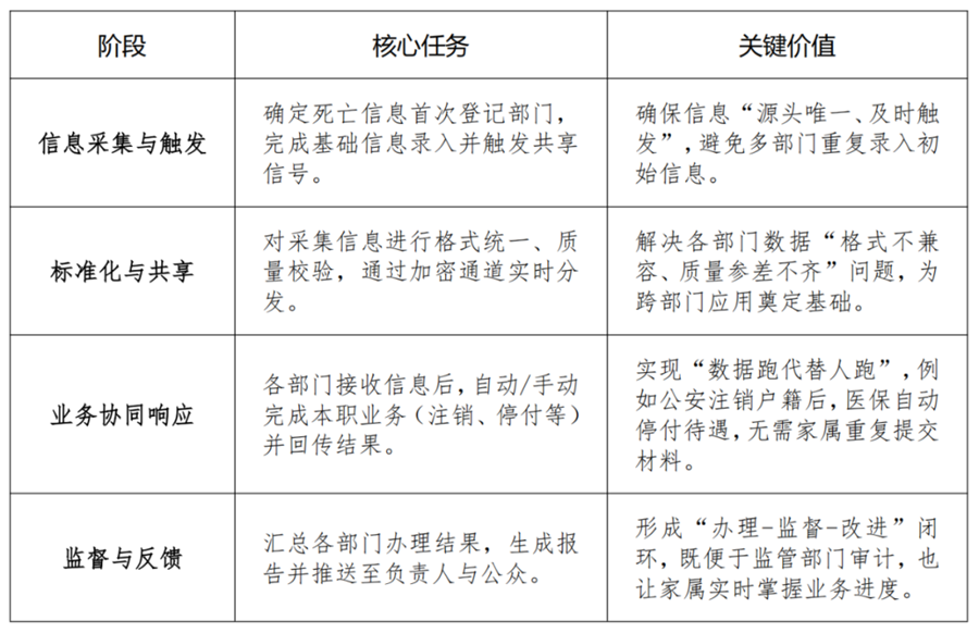出数据:建立公安、卫健、人社、民政与医保部门之间稳定、实时的死亡人员信息共享数据通道,实现死亡人员信息的及时、准确传输与共享。
