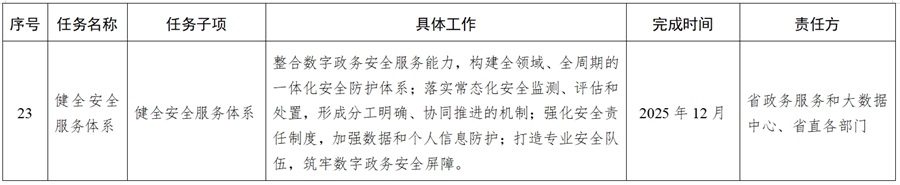 8.健全安全服务体系。整合数字政务应用安全服务能力,构建全领域、全周期、一体化的安全态势感知和防护体系;落实安全监测、评估、处置等常态化安全保障工作,形成分工明确、协同推进的工作机制;强化安全责任制度,加强数据安全防护,保障个人信息安全;打造数字政务安全保障专业队伍,筑牢安全屏障。