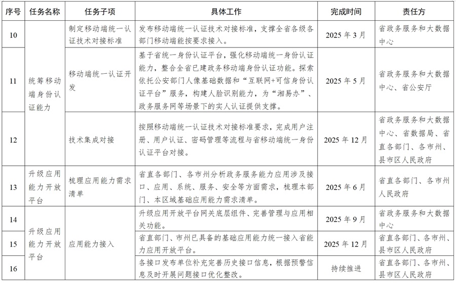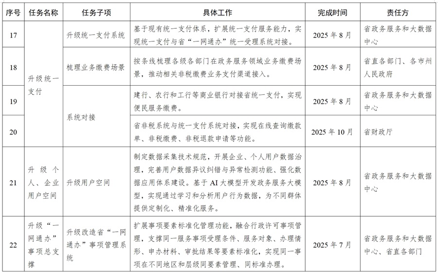 2025年12月31日前,统筹省级政务服务公共平台基础能力建设和保障,满足全省数字政务公共基础能力“总支撑”需求,通过完善统一身份认证、电子证照、电子印章、统一支付、统一用户中心、应用能力开放平台、AI大模型等基础支撑能力,全面支撑全省政务服务业务应用。整合数字政务应用安全服务能力,实现集中监控与管理,提升整体安全防护水平。