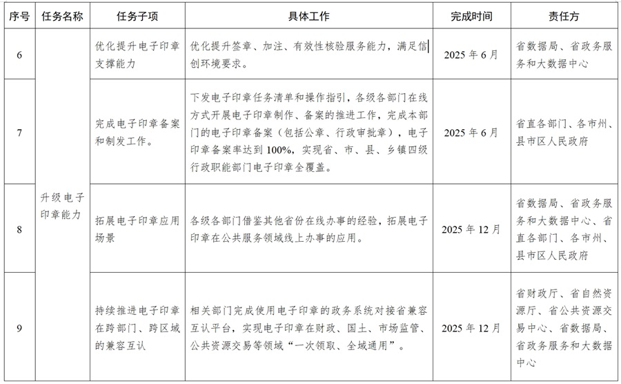 2.升级电子印章应用能力。升级电子印章在线审批、统一授权、统一核验、电子证照加注、兼容互认等功能及信创环境电子印章应用能力,满足电子证照和各类政务服务场景下的电子印章应用。各级各部门应完成本部门的电子印章备案申请(包括公章、行政审批章),电子印章备案率达到100%。探索在财政、自然资源和公共资源交易等领域推进电子印章的互信互认。
