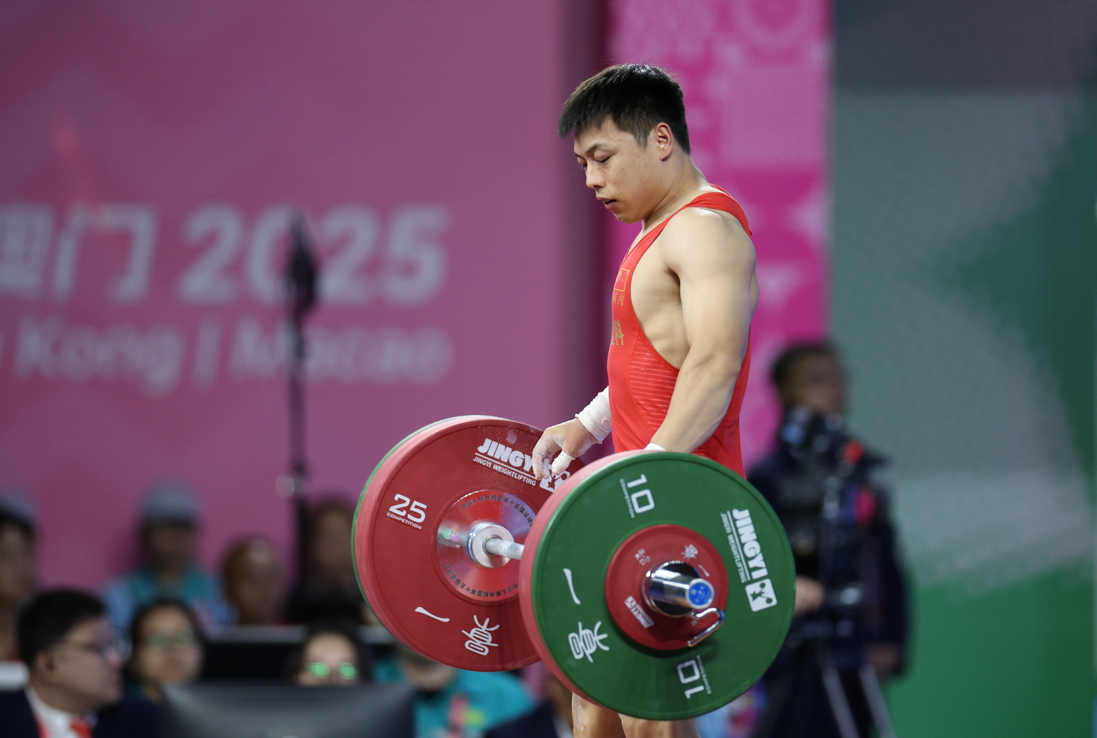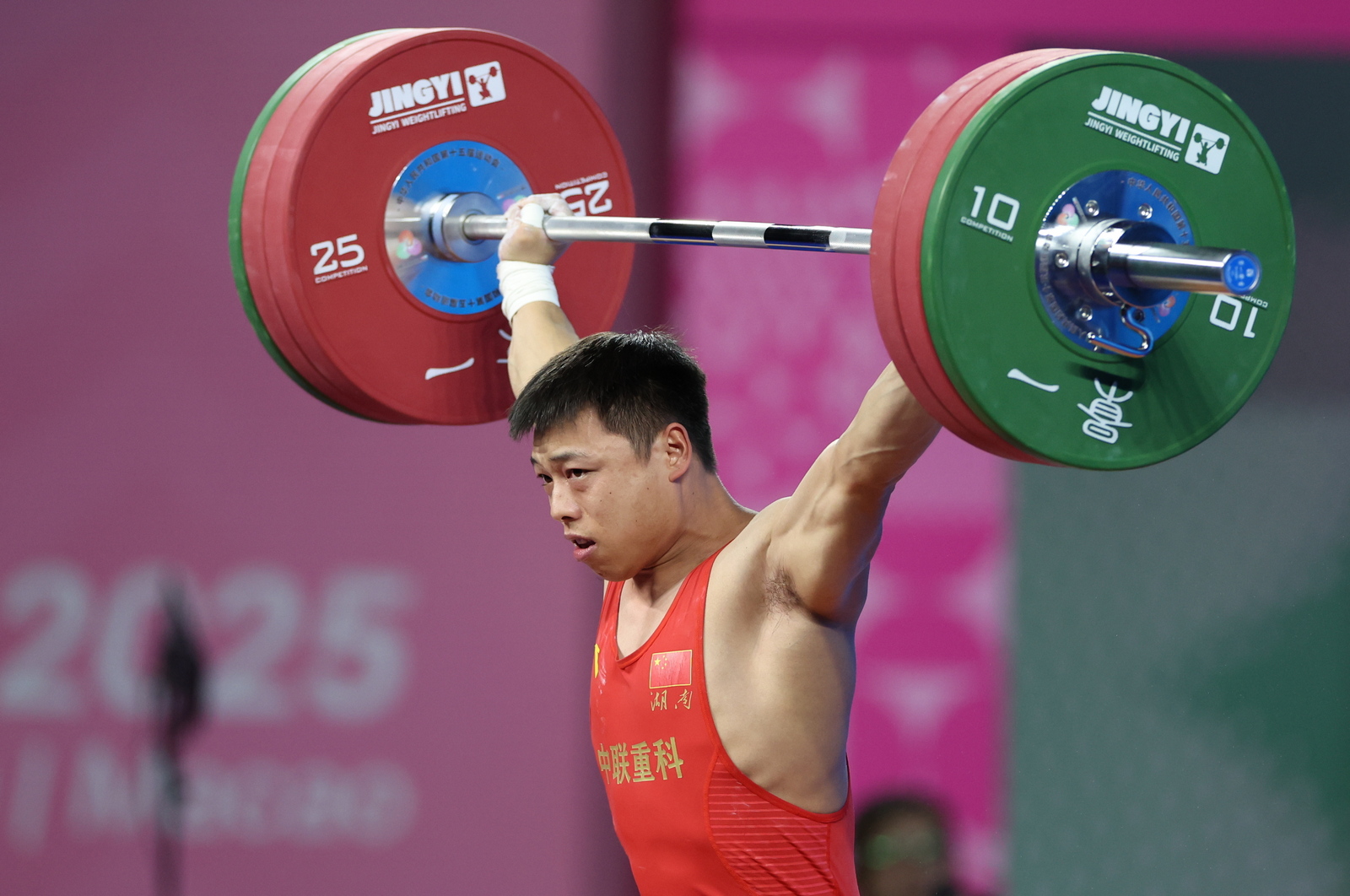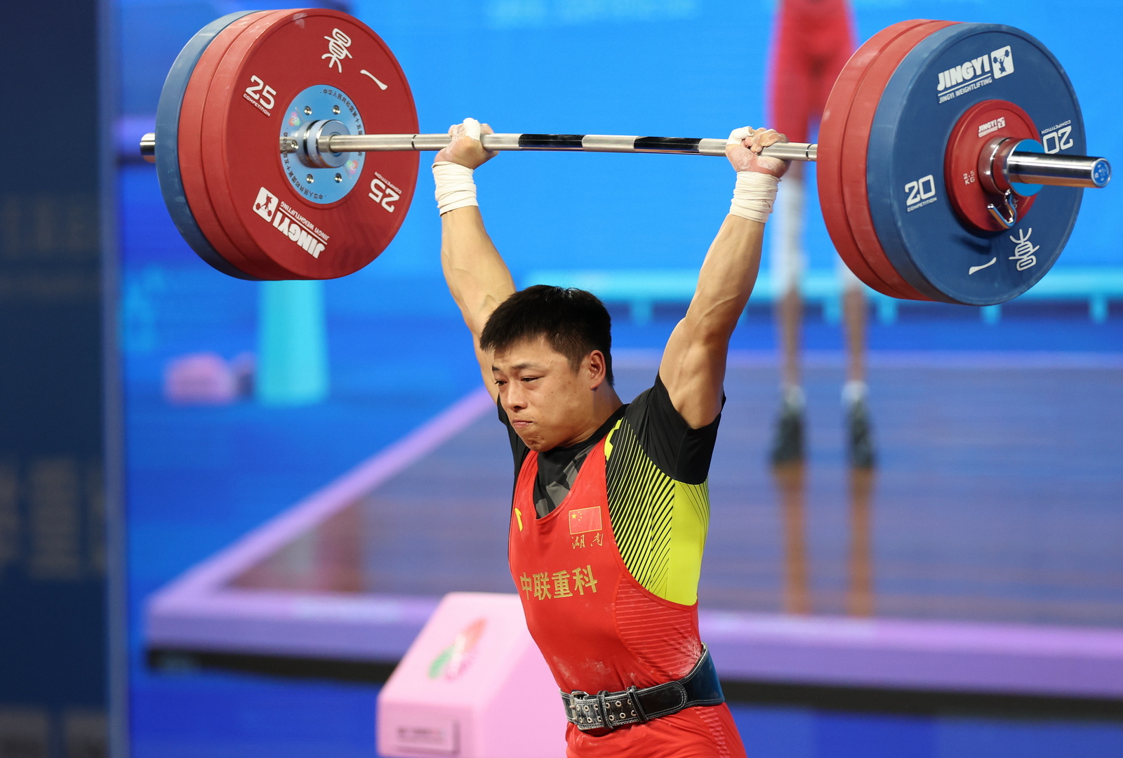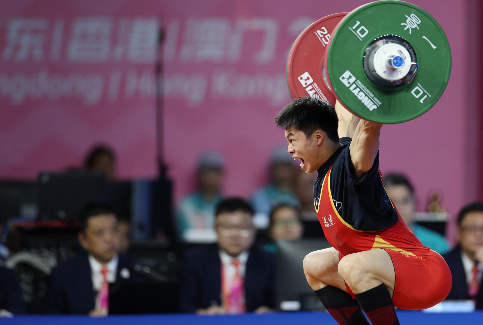 11月17日,第十五届全国运动会举重项目比赛继续在东莞石龙镇举行。图为湖南中联重科选手谌利军在男子67公斤级决赛中。