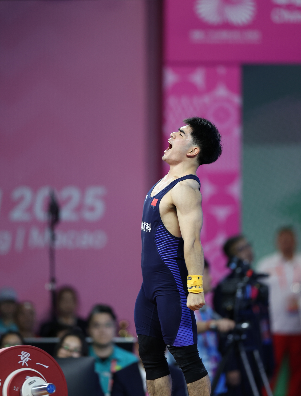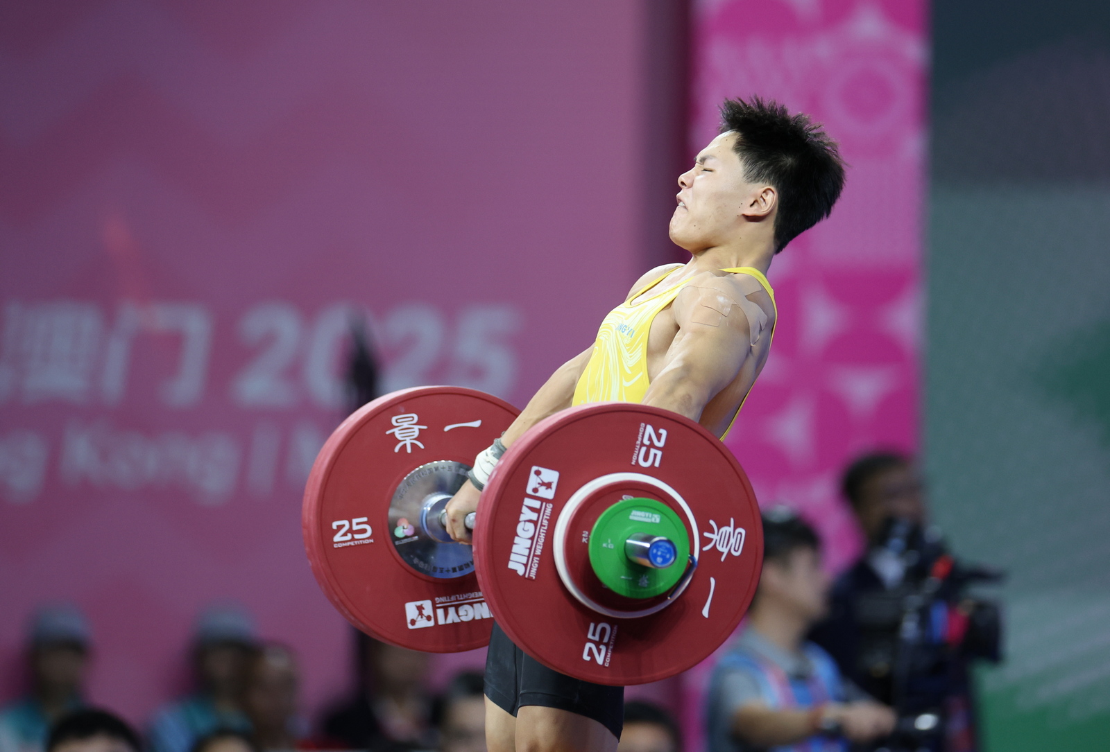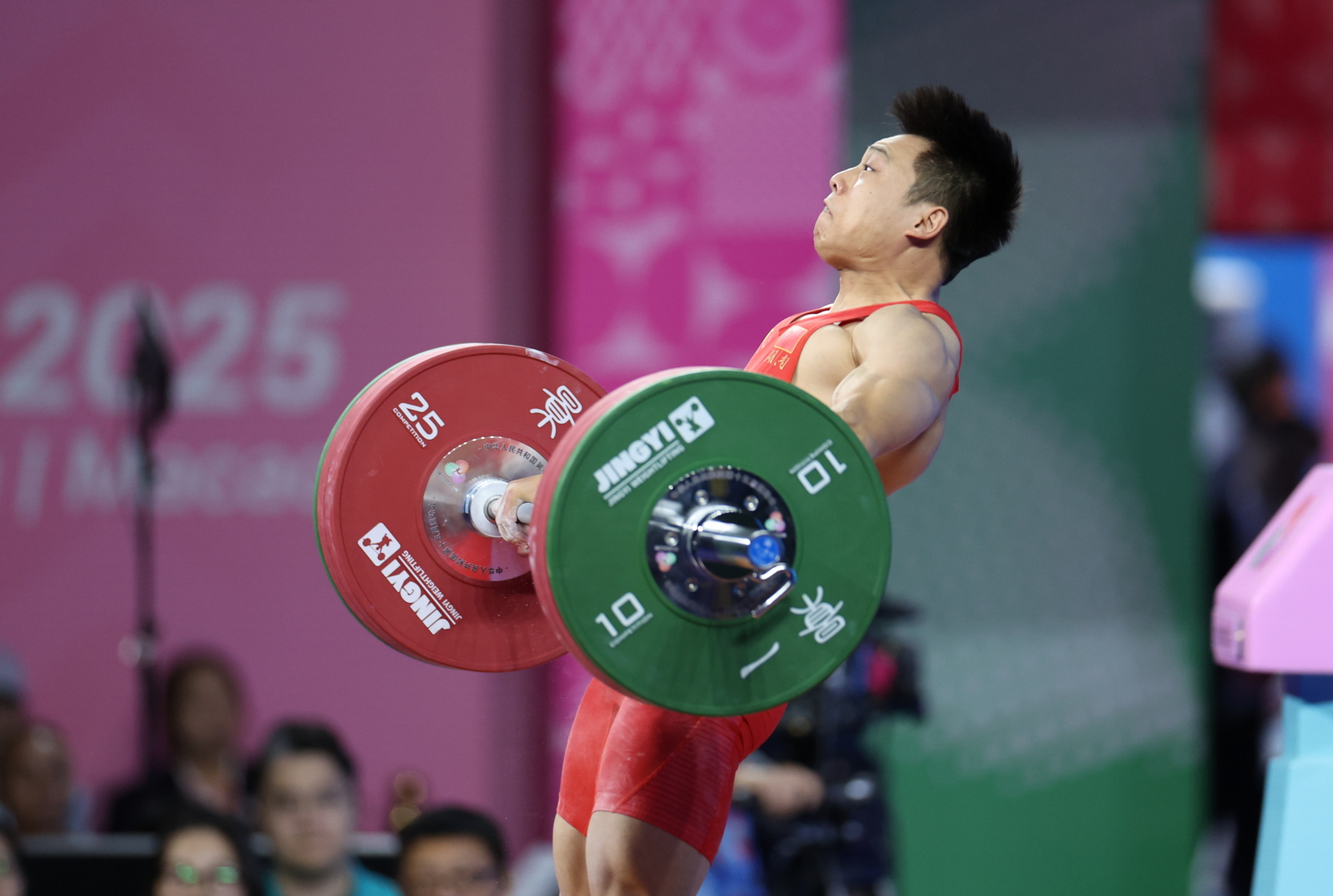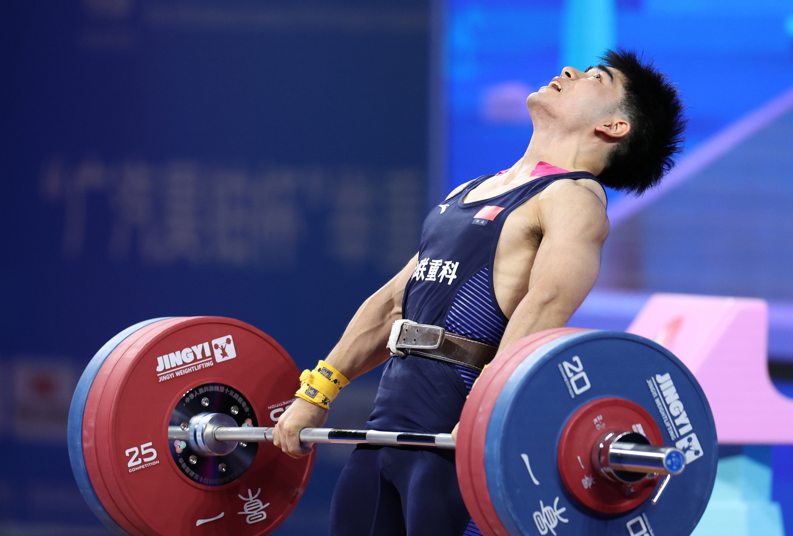 11月17日,第十五届全国运动会举重项目比赛继续在东莞石龙镇举行。图为湖南中联重科选手谌利军在男子67公斤级决赛中。