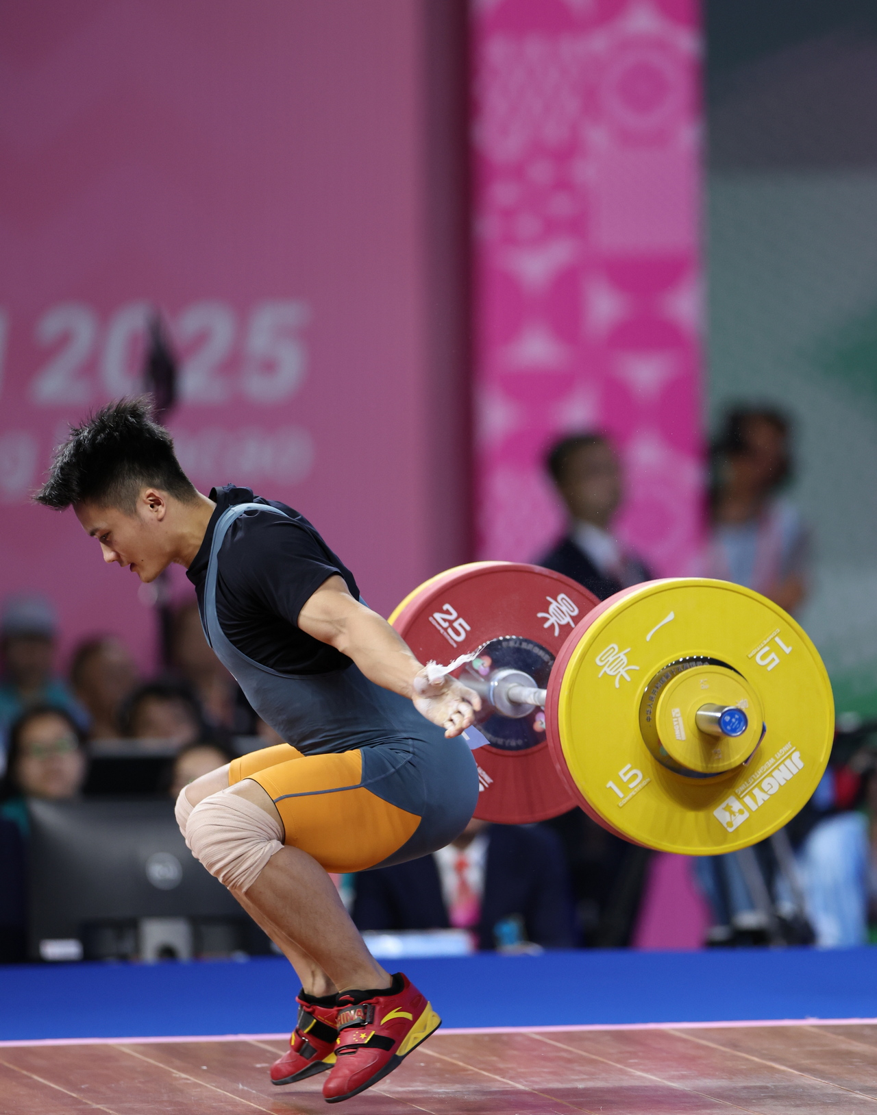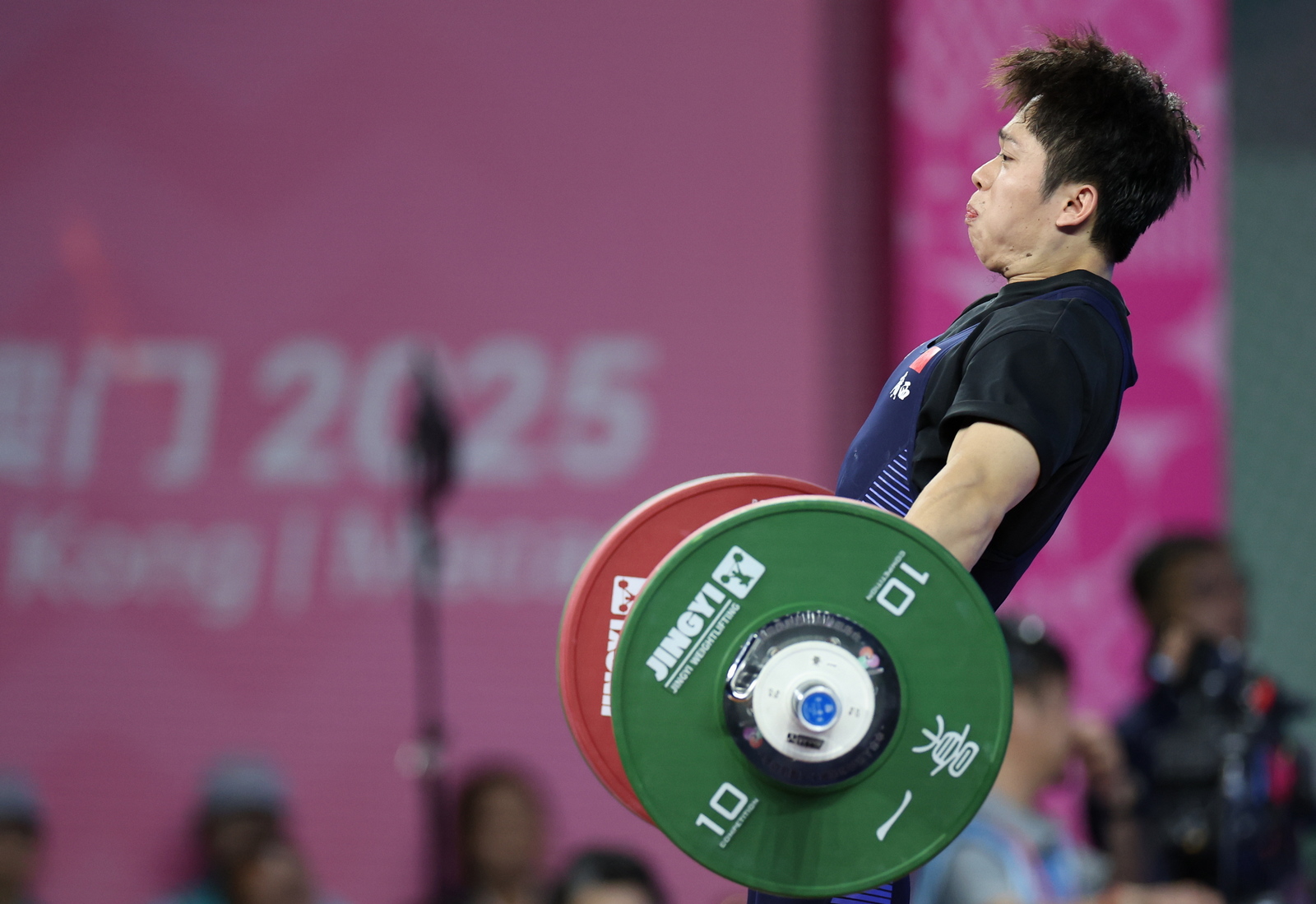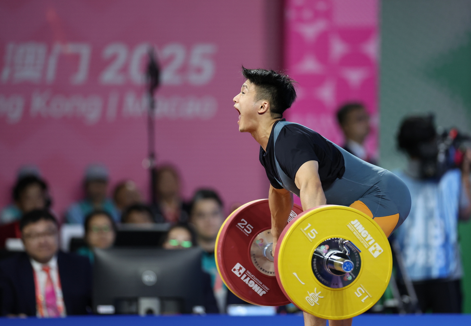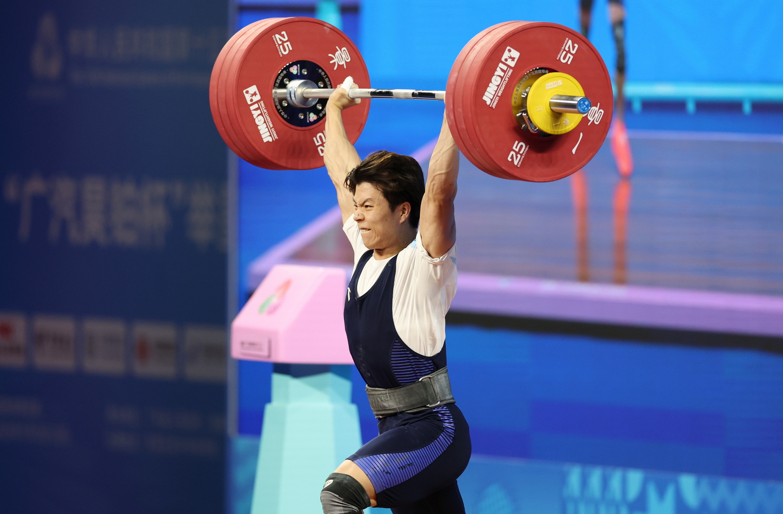 11月17日,第十五届全国运动会举重项目比赛继续在东莞石龙镇举行。图为湖南中联重科选手谌利军在男子67公斤级决赛中。