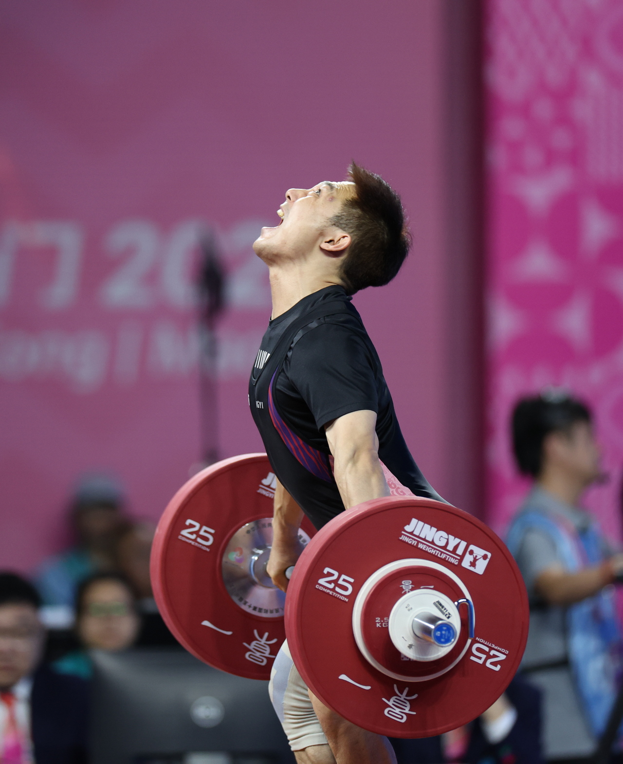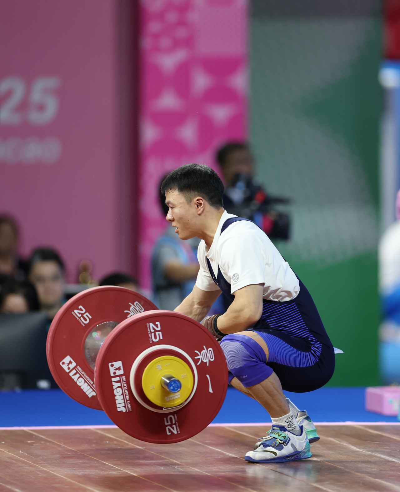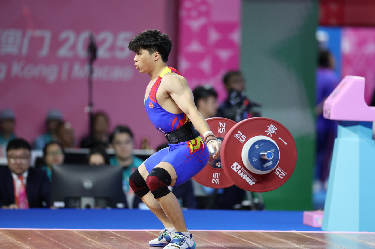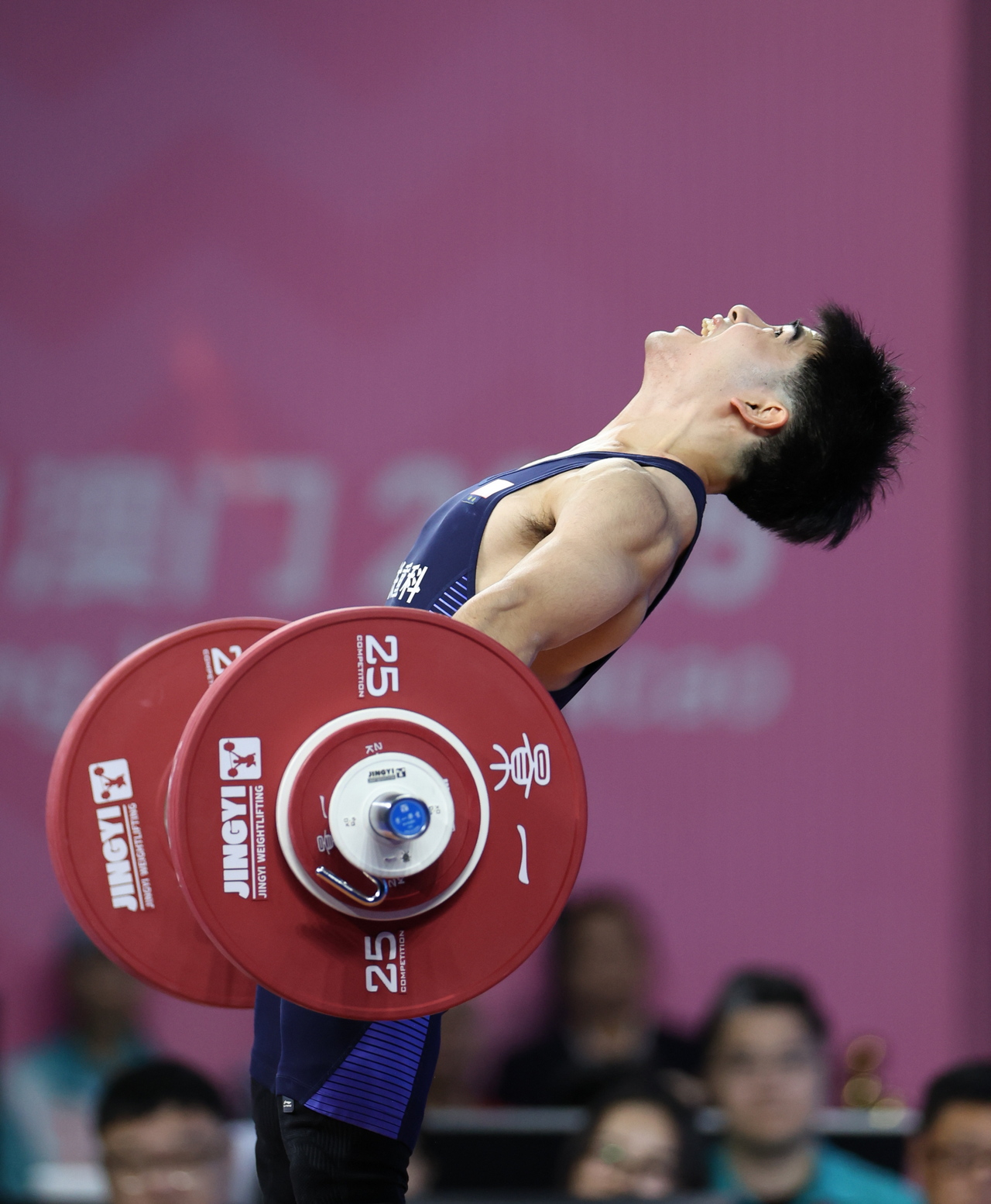 11月17日,第十五届全国运动会举重项目比赛继续在东莞石龙镇举行。图为湖南中联重科选手谌利军在男子67公斤级决赛中。