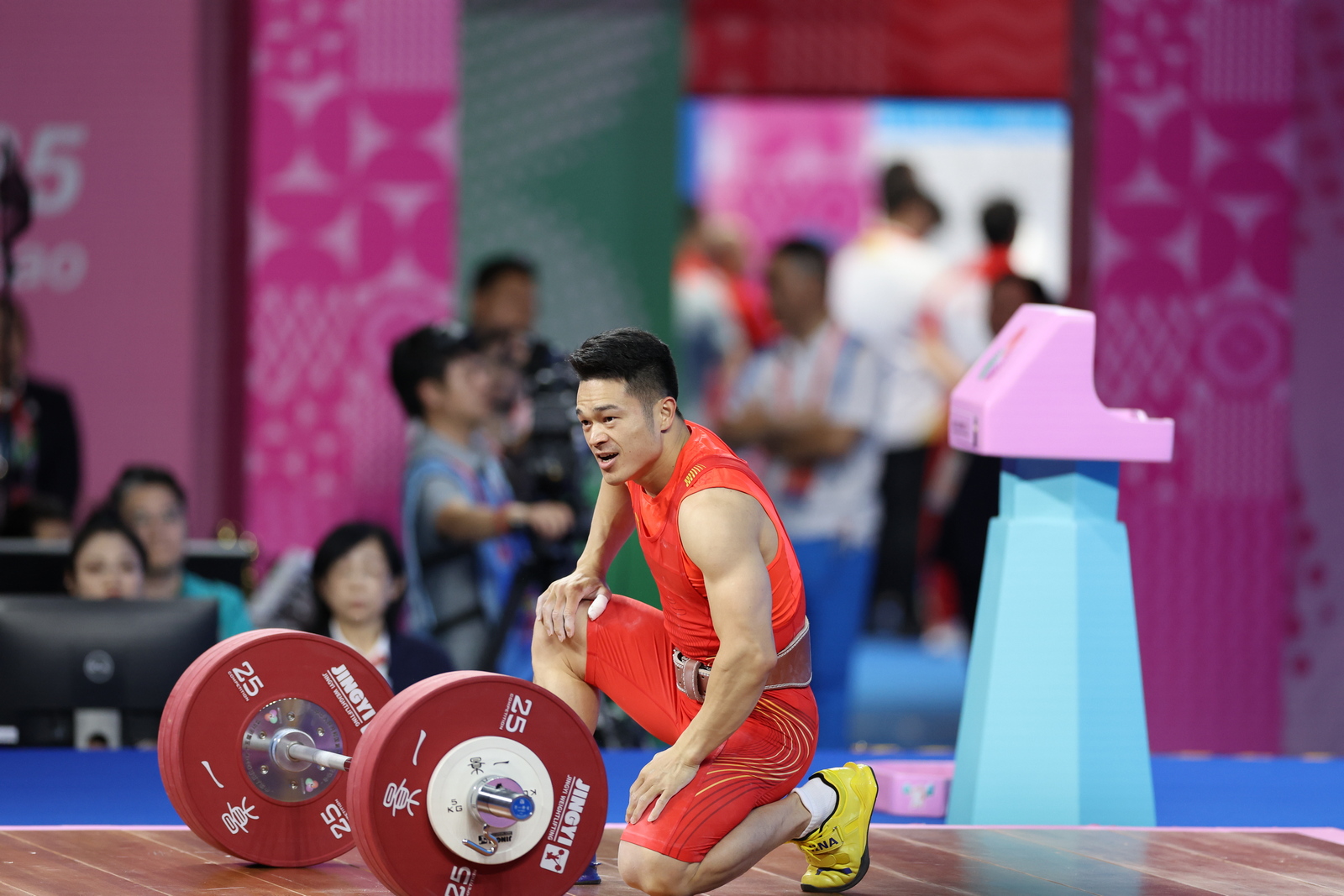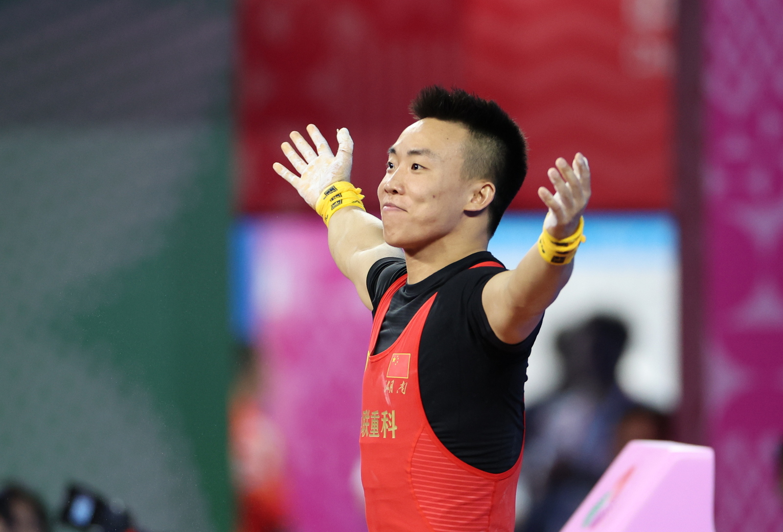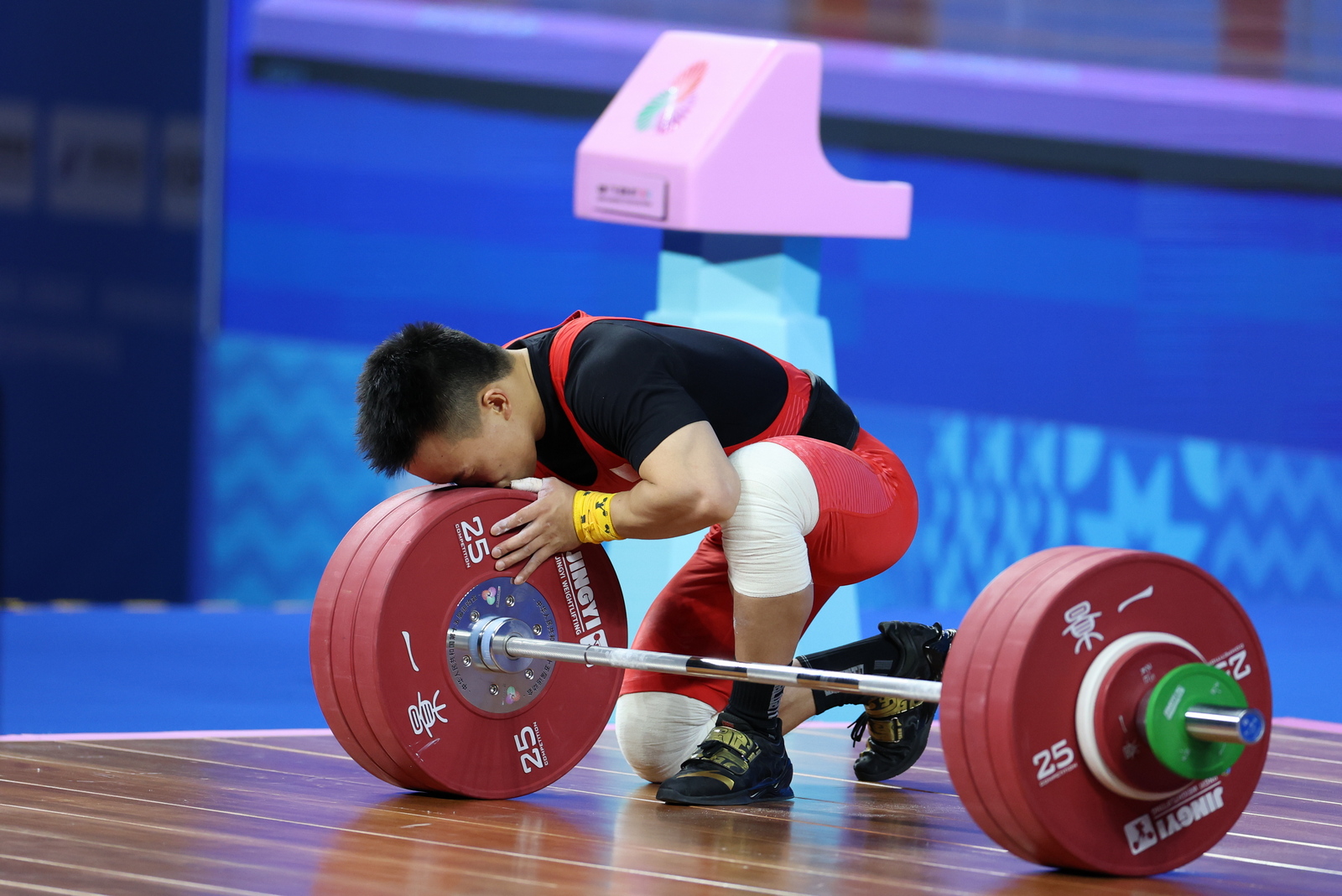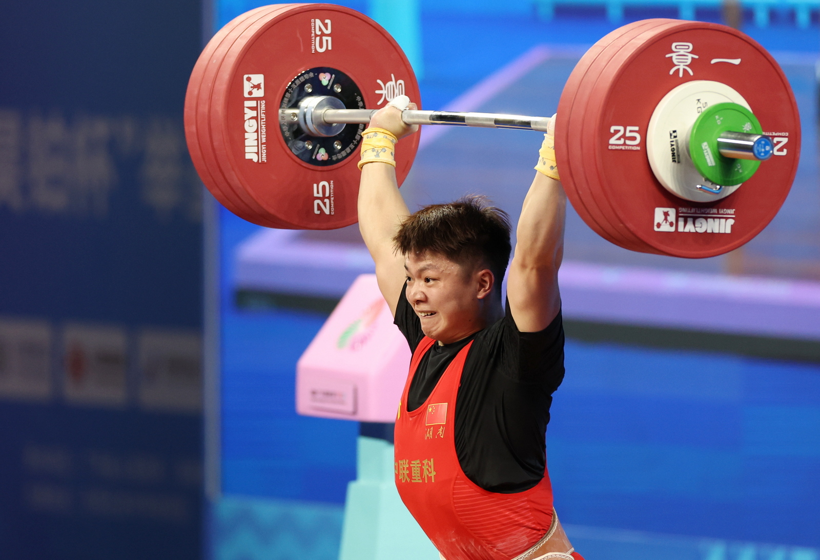 图为湖南中联重科选手彭政林在比赛结束后中亲吻杠铃。